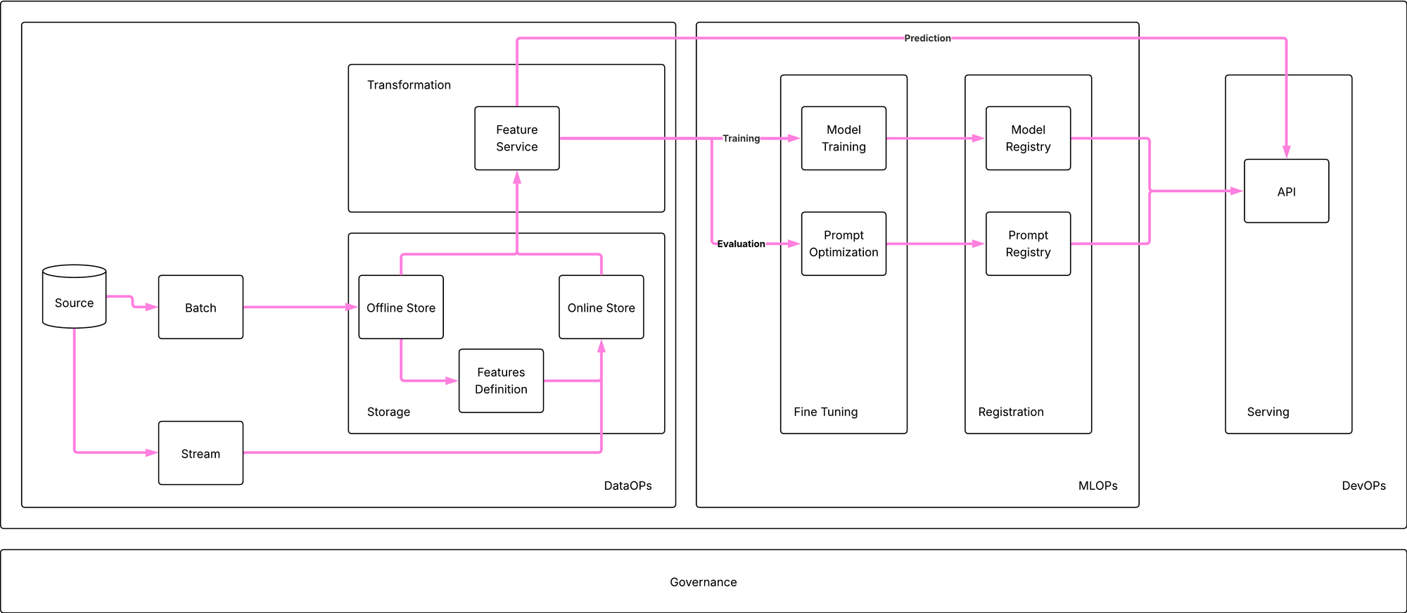 While ML needs online data for prediction, AI does need data for prompt optimisation but it also requires a context at prediction time: which means that the data needs to be properly indexed. This doesn't necessarily require building two different processes. Both AI and ML applications can be built on top of the same data infrastructure. This unified infrastructure allows to flexibly design features that are available for downstream AI and ML models. How do we define a feature in this framework?