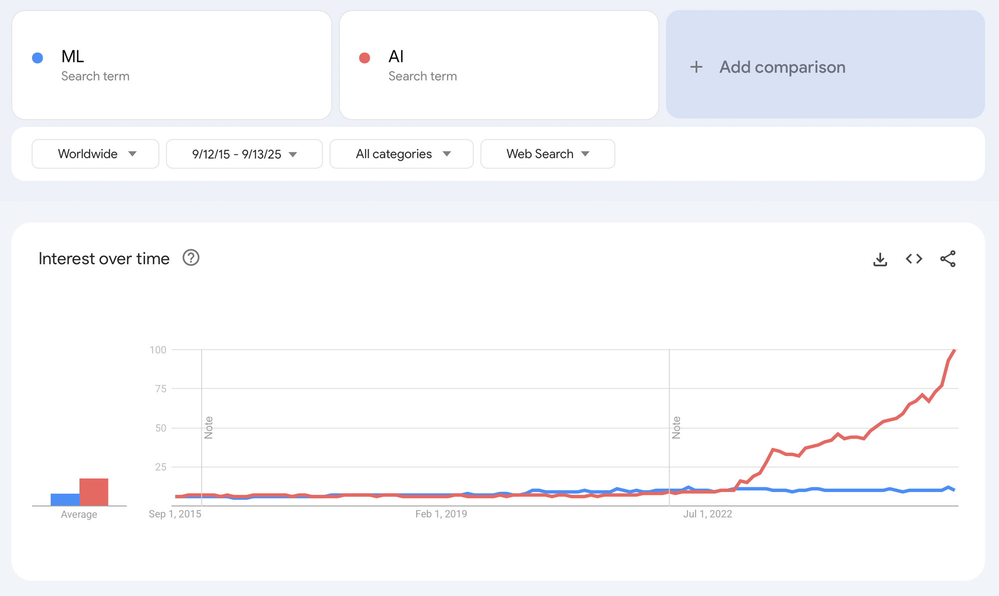 As someone that has been working in this field for about 12 years, it's very odd to see how the term machine learning has fallen out of fashion for the flashier AI. Though AI has always been quite popular, I do remember a distinctive period before the emergence of LLM when data science, and machine learning were the trendier terms. This came about with the successes of companies like Spotify, Netflix, Uber, Airbnb and their forward thinking product data science organisations whose success relied on progress in recommender systems, predictive analytics ...